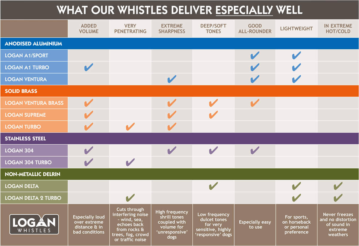 "The responses from dogs differ greatly depending on how sensitive to sound they are so the A1, Delta and Logan 304 are ideal for very responsive dogs, where the brass Supreme and the Turbo come in to their own with a less responsive dog. Reaching a great distance in bad conditions will also become easier to communicate with your dog with these two whistles." Julie Hill